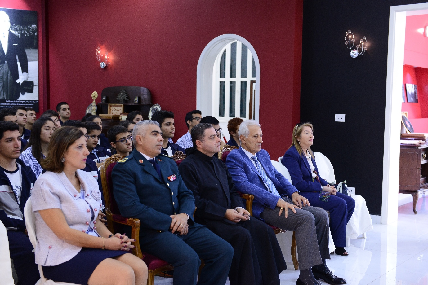 افتتح اللقاء بالنشيد الوطني، تبعه كلمة لمدير عام المدرسة الأب وديع السقيّم رحَّب فيها بالضباط المحاضرين، ومن أبرز ما جاء فيها: